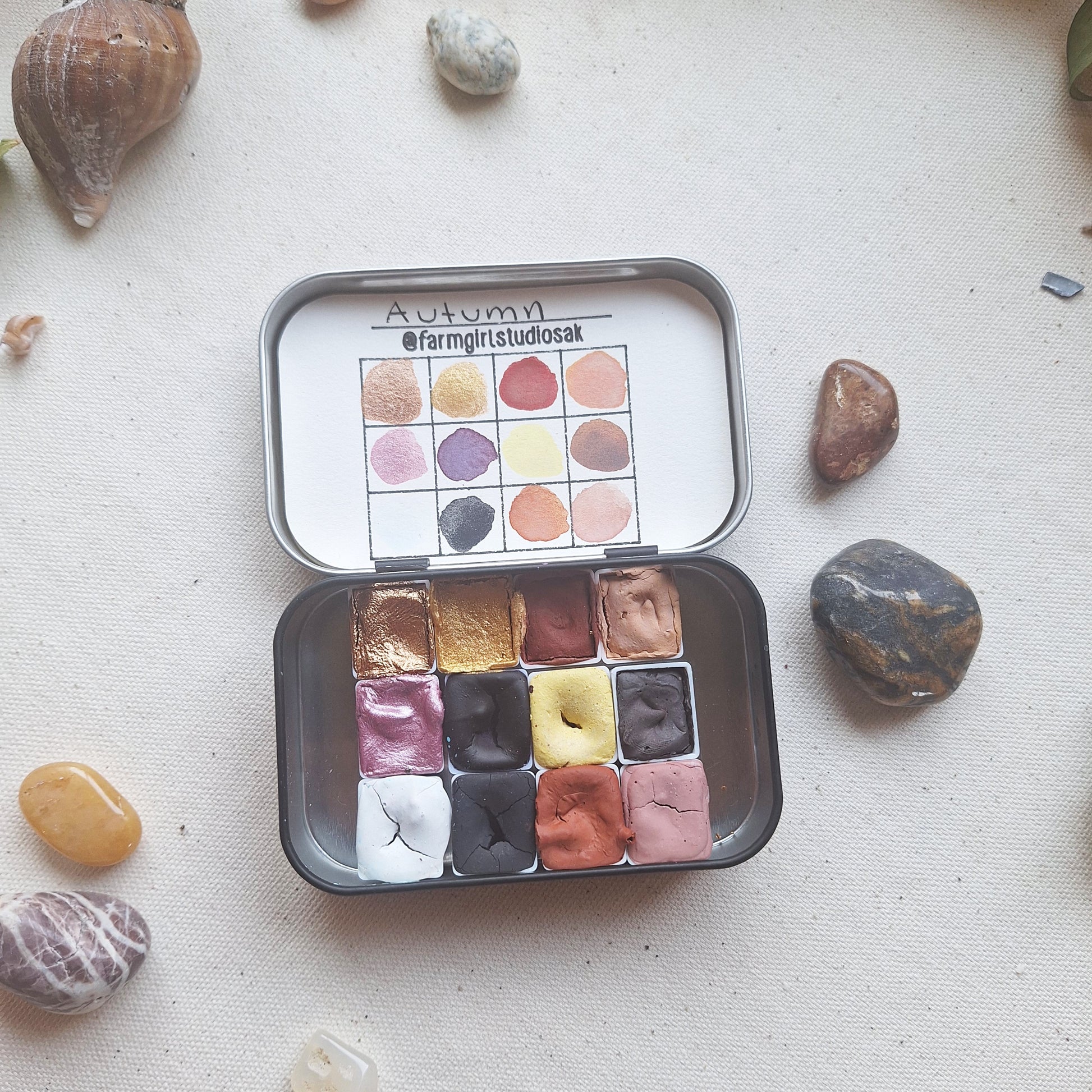 Each pan and tin is hand assembled. Humidity and temperature during transit can cause drying, cracking or stickiness. Simply wet a brush and mix in paints to create desired consistency. Store in a cool dry place.