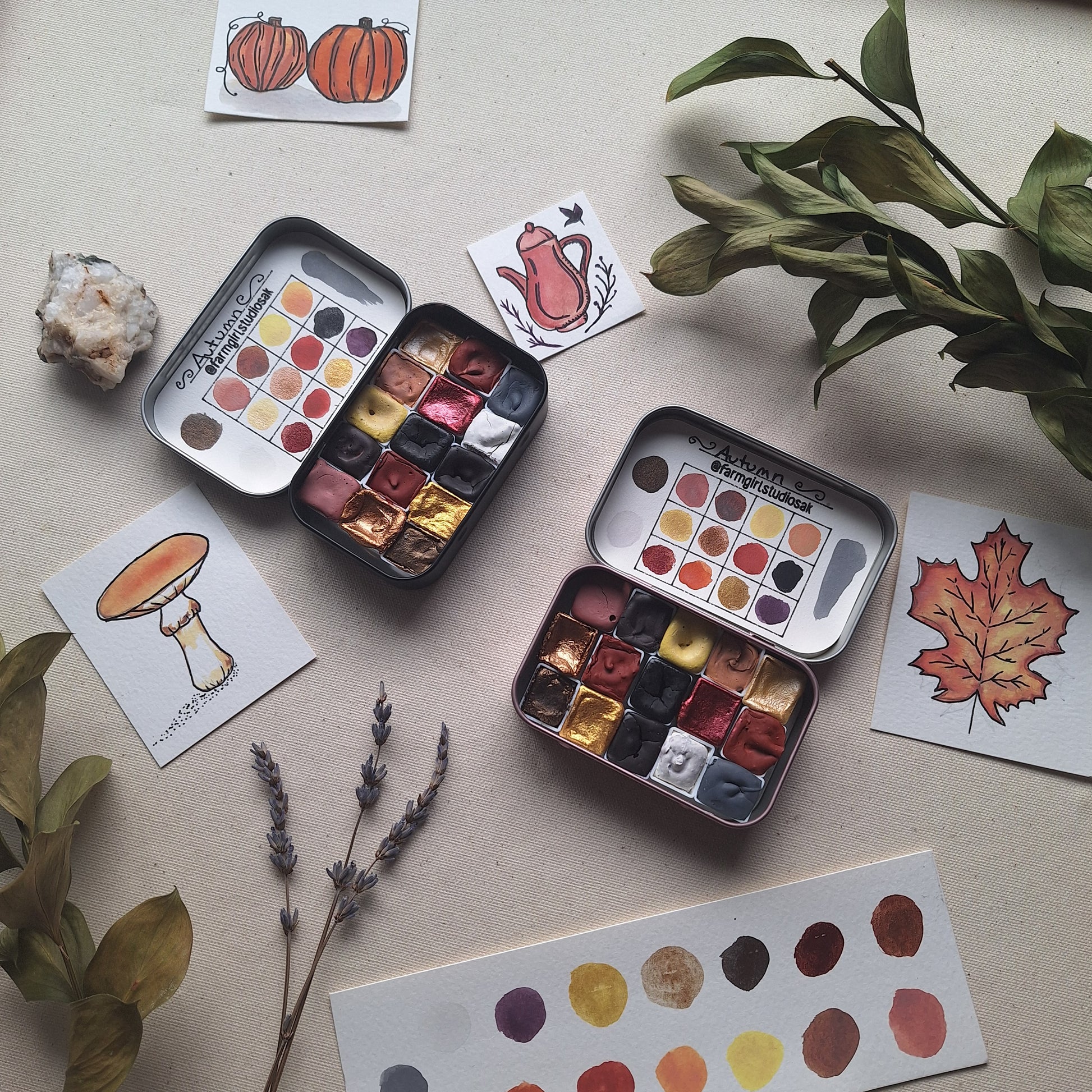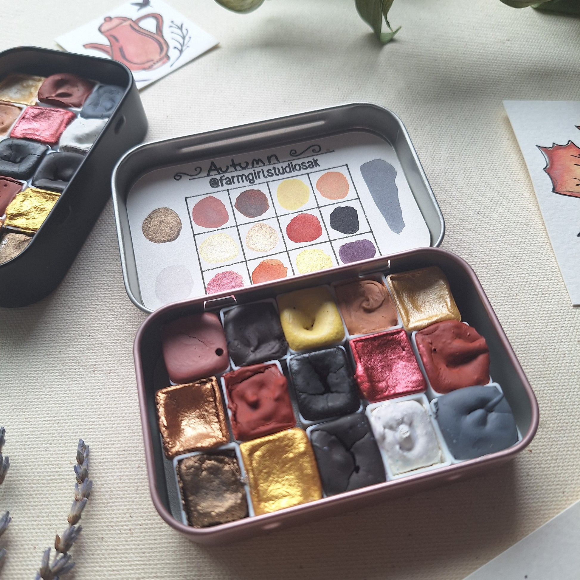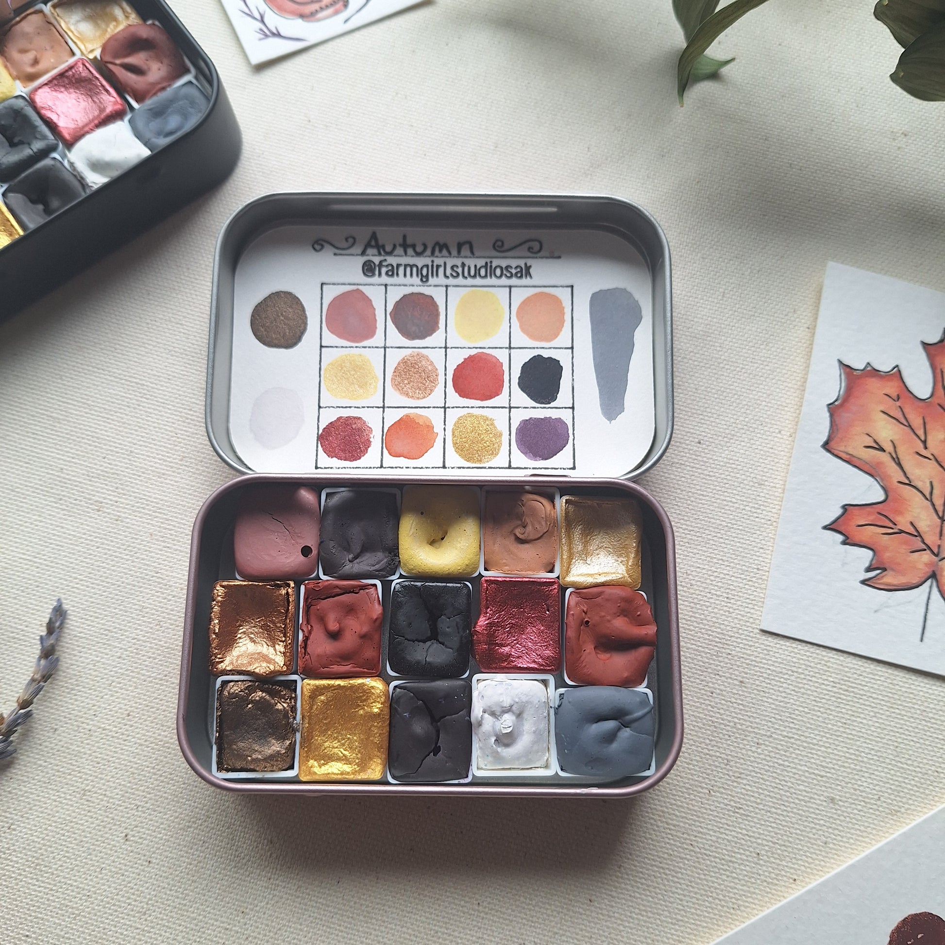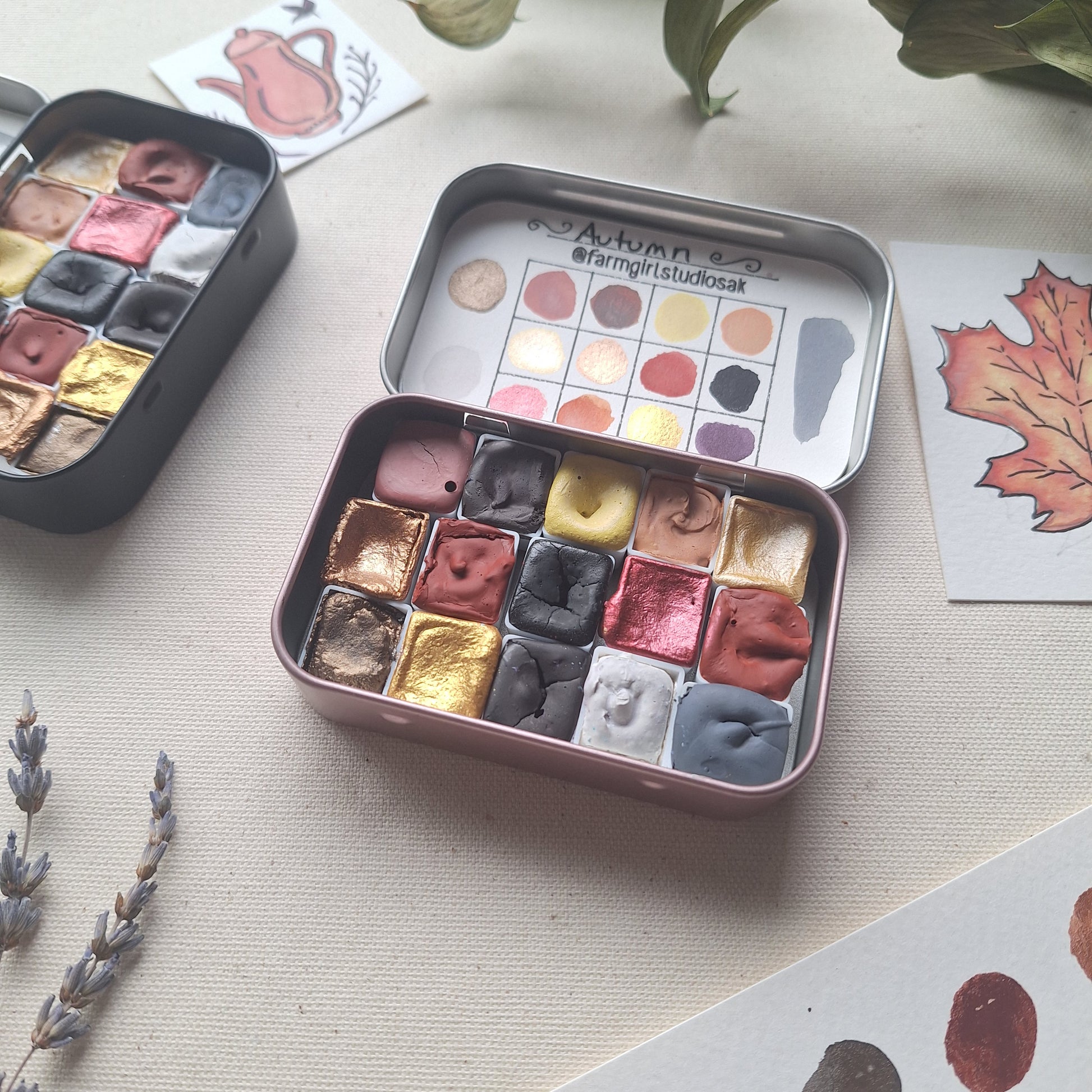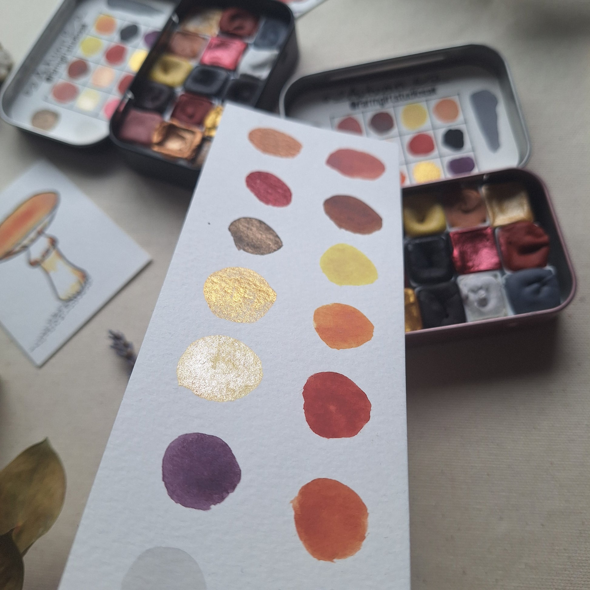 Handmade 15 pan watercolor tin. Included is 10 opaque colors + 5 metallic colors, crafted with your art in mind, giving off rich, vibrant hues. These 15 colors are the perfect addition to your collection.
