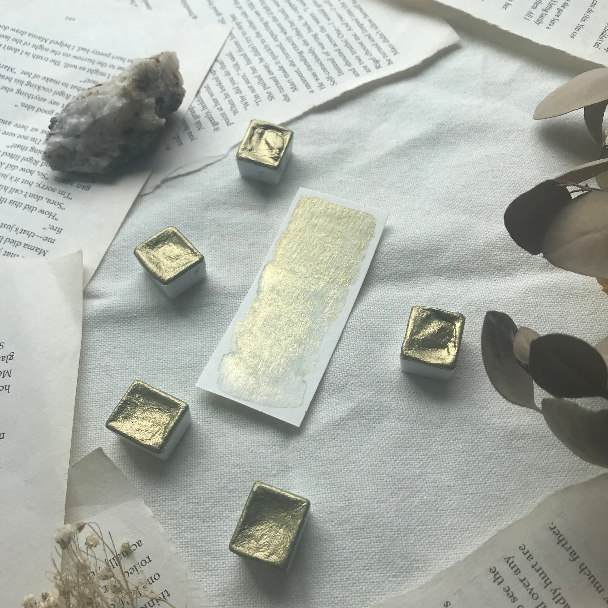Handmade metallic leaf green watercolor paint. 1 single half pan.