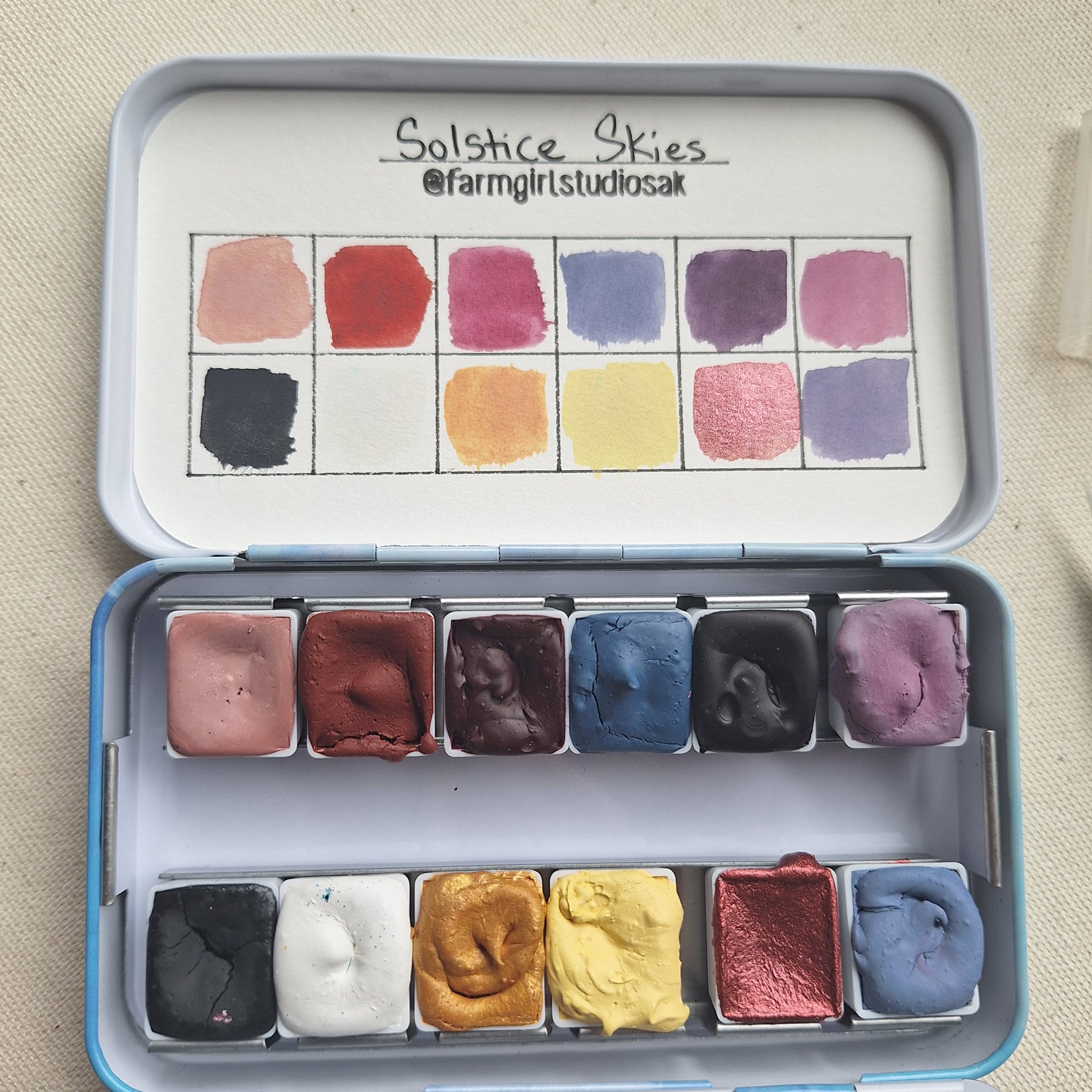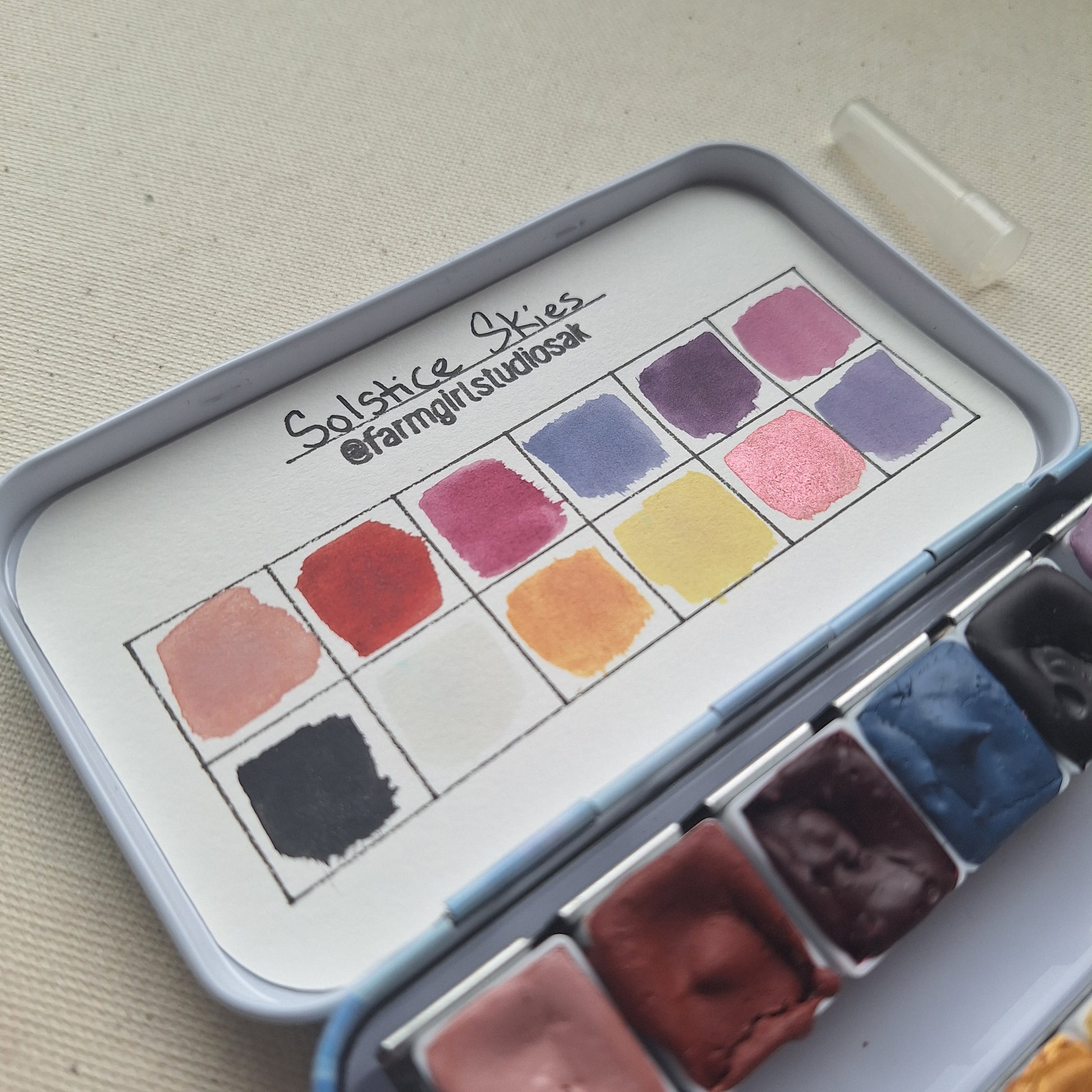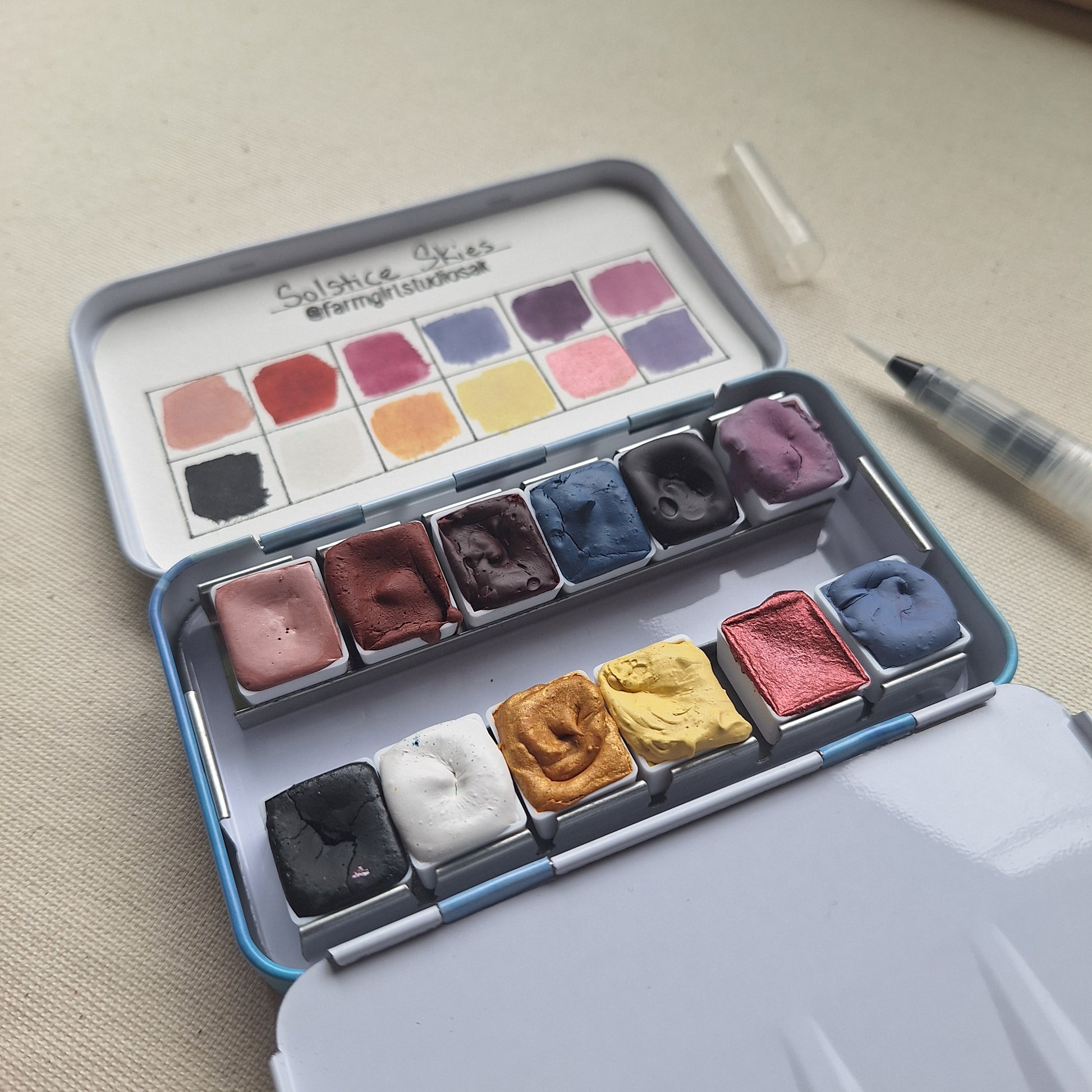 Each pan and tin is hand assembled. Humidity and temperature during transit can cause drying, cracking or stickiness. Simply wet a brush and mix in paints to create desired consistency. Store in a cool dry place.