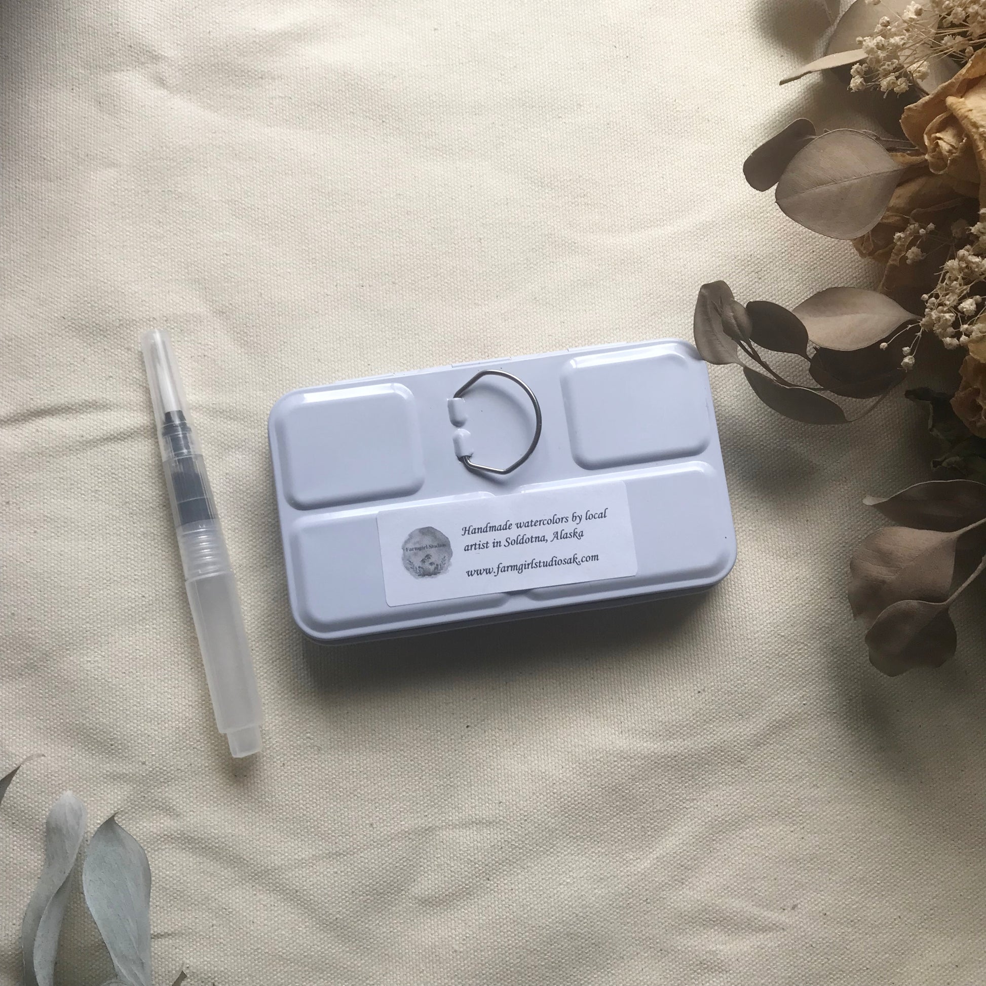 Each pan and tin is hand assembled. Humidity and temperature during transit can cause drying, cracking or stickiness. Simply wet a brush and mix in paints to create desired consistency. Store in a cool dry place.
